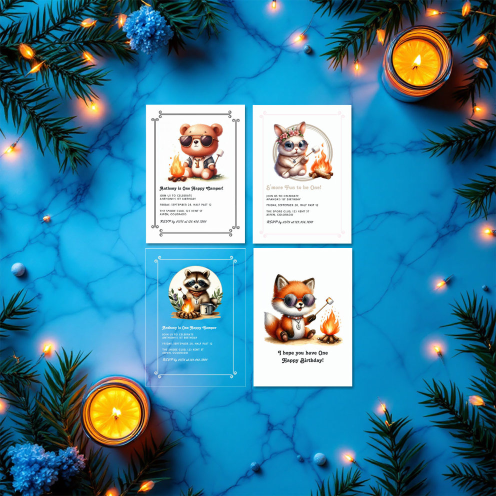 Celebrate your little explorer with our 1st Birthday Camping Party collection — where woodland charm meets outdoor adventure! Featuring adorable woodland animals roasting marshmallows, cozy campfire scenes, and phrases like "One Happy Camper" and "S’more Fun to Be One!" This collection includes custom invitations, thank-you cards, s’more-themed favors, personalized blankets, and more — all wrapped in rustic plaids and nature-inspired details. Perfect for a birthday bash under the stars or your own backyard campground!