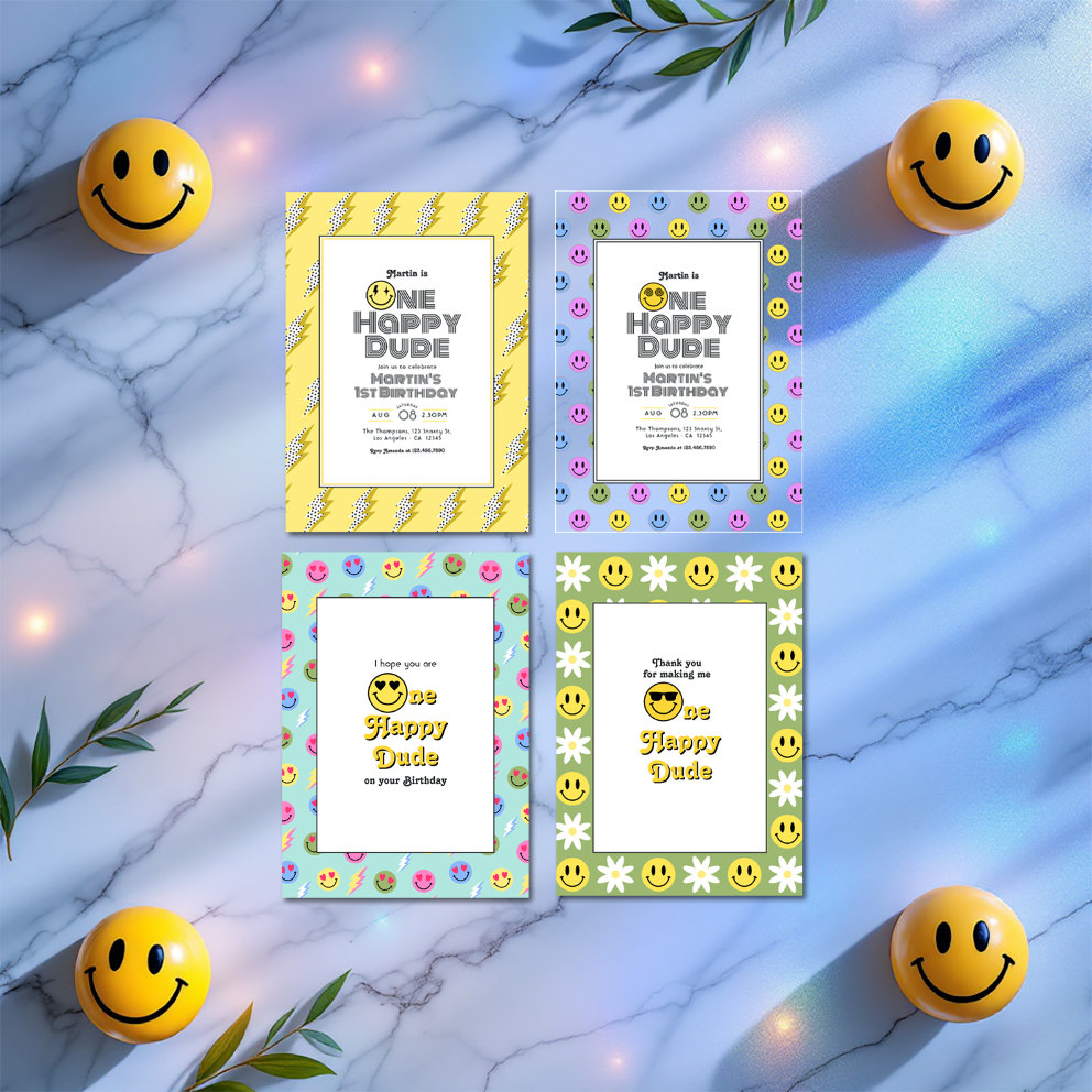Peace, love, and lightning bolts! The One Happy Dude Retro Smiles Birthday Collection brings a blast of 70s joy to your little one’s big day. Featuring bold yellow hues, retro-inspired fonts, and cheerful face artwork, this collection is designed to spread good vibes and big smiles. From invitations and balloons to tablecloths and teddy bears, every piece adds a splash of happiness to your groovy celebration.