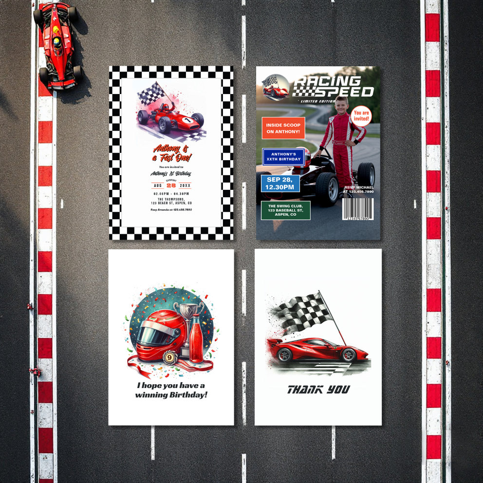 Buckle up for birthday fun with our Race Car Birthday Collection! Perfect for little speedsters turning one, two, three, four—or any age—this collection brings the excitement of the track to your party. Featuring classic red race cars, checkered flag patterns, and customizable invites, stickers, thank you cards, and even VIP Pit Crew passes, it’s the ultimate way to celebrate in high gear. Whether your kiddo is a “Fast One” or “Too Fast,” this collection will leave party guests racing to the finish line with smiles.