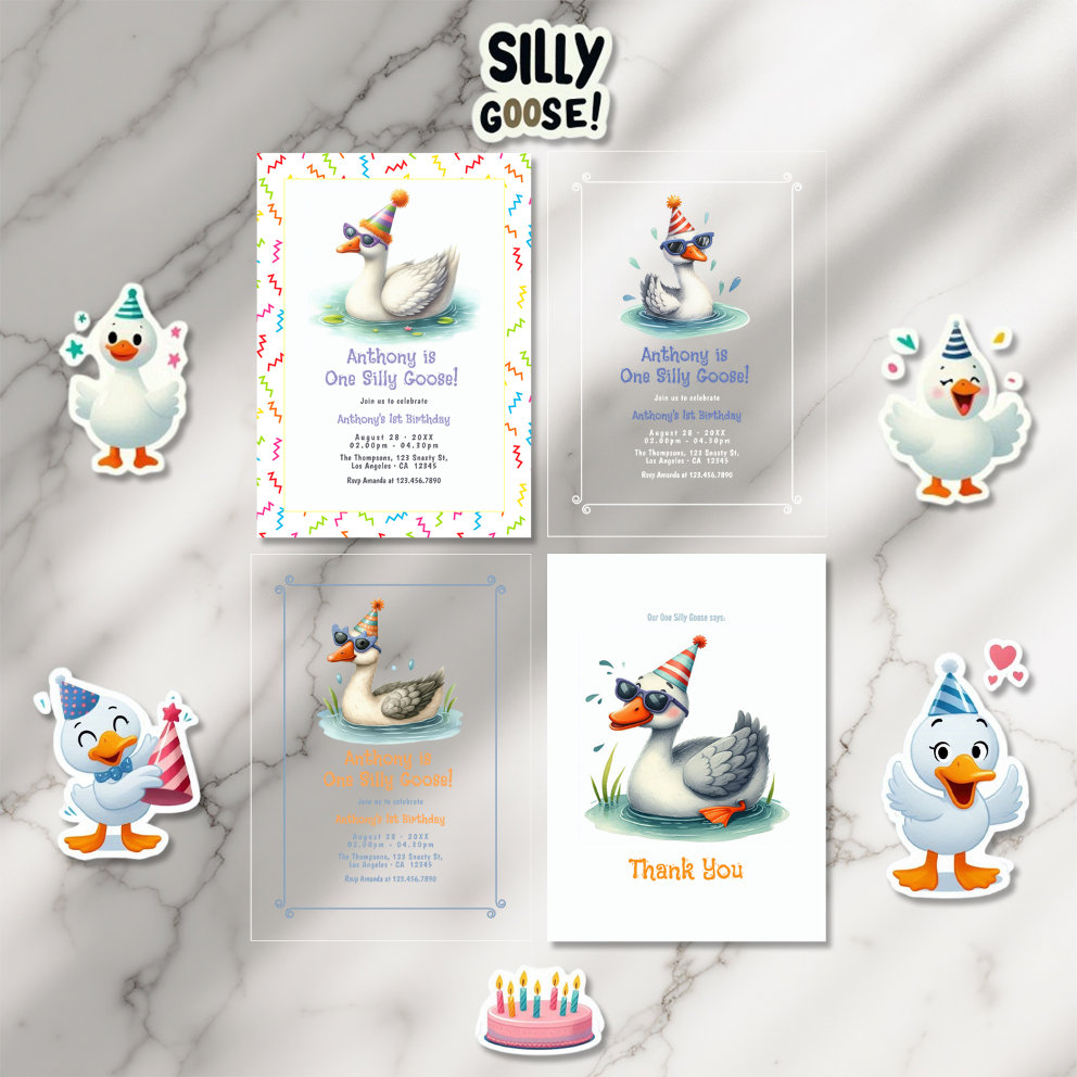 Bring the quacks and laughs with our One Silly Goose First Birthday Party Collection! This playful suite includes everything you need for a whimsical celebration: crystal-clear or vellum overlay invitations, personalized envelopes, confetti-covered plates and napkins, adorable party hats, round vinyl stickers, favor bags, gift tags, and even a custom baby onesie. Each piece features our signature party-hat–wearing goose design and is fully customizable with your child’s name and details. Crafted on premium, eco-friendly materials, this cohesive collection makes planning a lighthearted, memorable birthday bash a breeze.