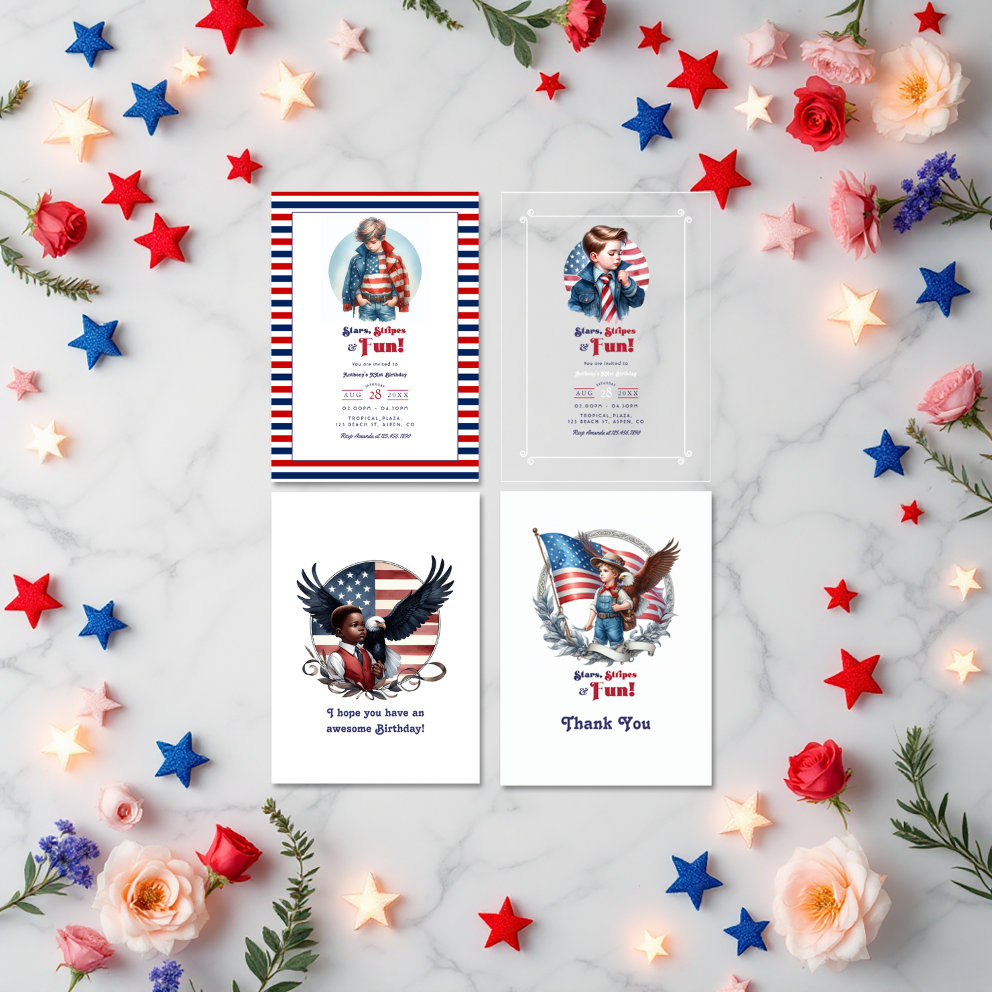 Get ready to celebrate in true red, white, and woo-hoo! style with our American Boy Birthday Party Collection! Featuring bold stars, classic stripes, and a whole lotta patriotic pride, this collection is bursting with vibrant reds, deep blues, and crisp whites. From “Stars, Stripes & Fun!” invitations to all-American thank-you cards, favor tags, and magazine-style birthday invites, each piece captures the spirit of freedom and childhood joy. Whether your little guy is turning one or gearing up for a Fourth of July birthday blowout, this collection is made for proud parents and party guests alike.