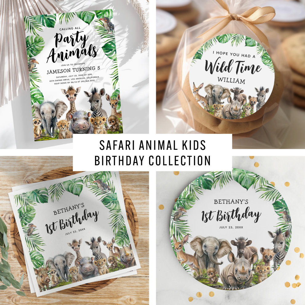 Get ready to roar, stomp, and swing into fun with our Animals Birthday Party Collection! Whether you're celebrating a "Wild One", going "Two at the Zoo", or feeling "Young, Wild & Three", this collection is packed with party animals dressed to impress in sunglasses and party hats! With playful jungle prints, safari-inspired details, and custom touches, it's the perfect way to bring the zoo to you. From invitations to favor tags, this untamed collection is here to make your little one's big day wildly unforgettable.