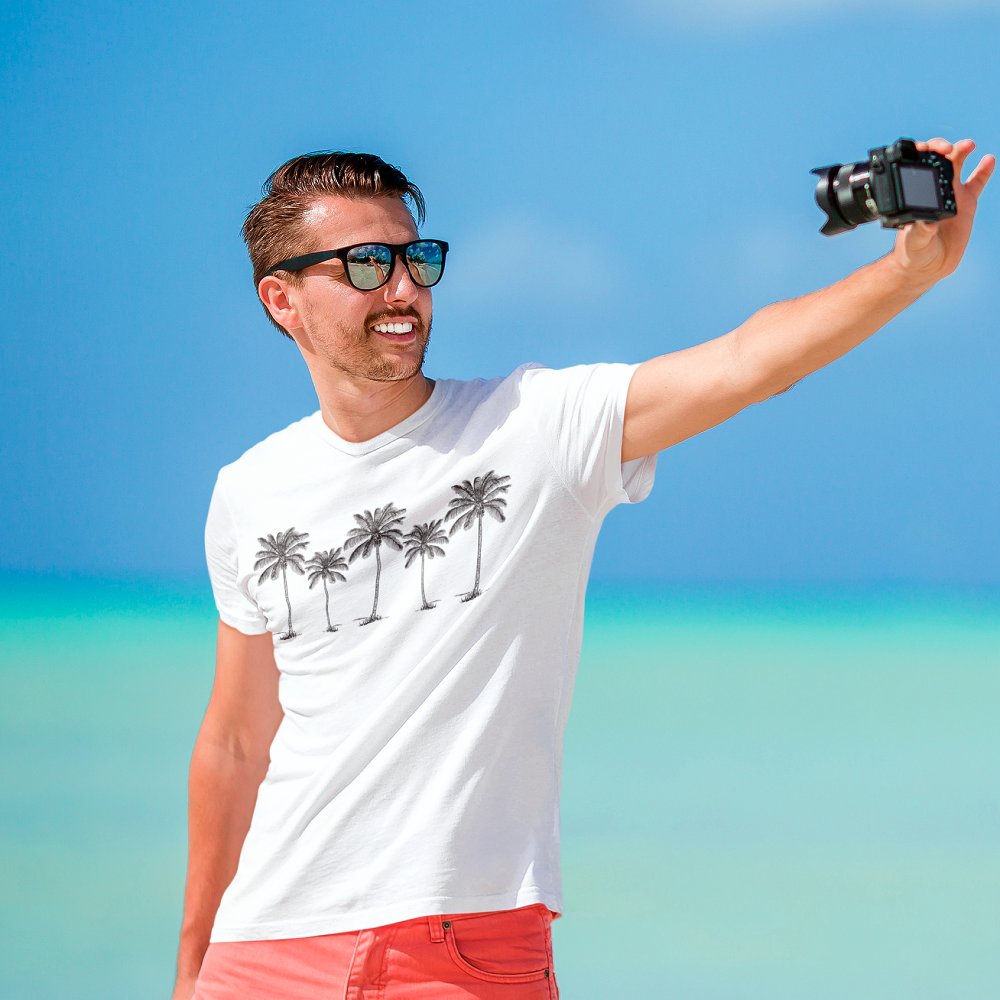 Tropical coconut palm trees silhouettes graphic tshirt. Black and white line drawing of coconut palms are an iconic symbol of paradise by the sea. Perfect summer beach trip fashion for anyone who lives at or loves the coast.