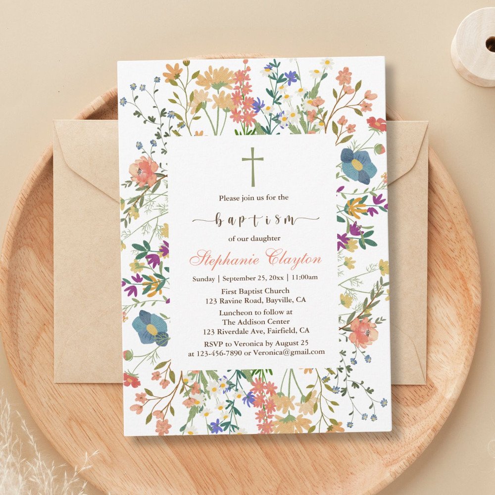 Wildflower floral baptism invitation. A lovely wildflower frame with a cross. Extend a heartfelt custom invitation to your family and friends by inviting them to join a spiritual journey of faith and new beginnings with our baptism invitation.