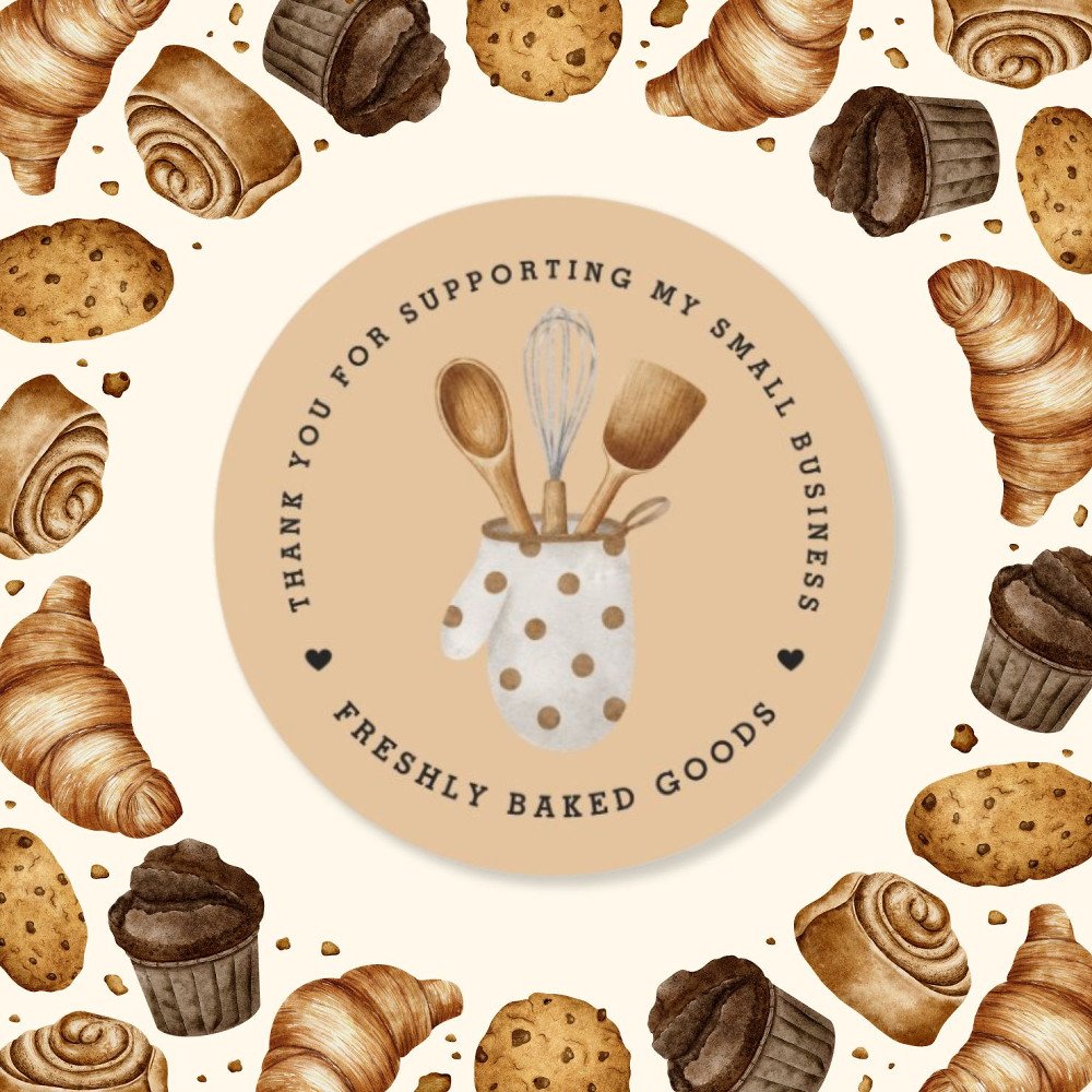 Modern custom bakery thank you sticker. A cute wooden utensil brown polka dot potholder set in the center of the sticker, thank you for supporting my small business is above it and below it is the name of the business.